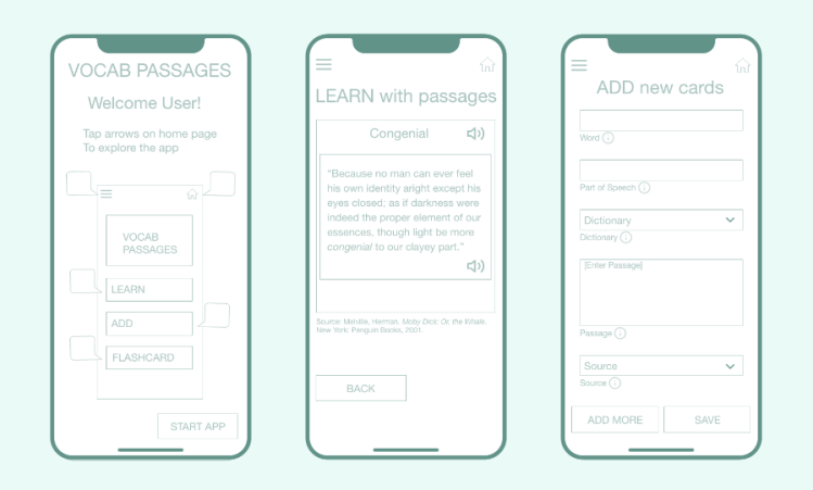 Focus on the ideation and initial creation of an app that teaches new vocabulary using book excerpts