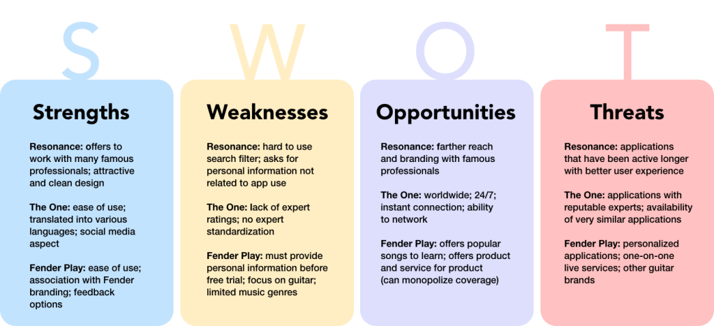 Obtaining information on what is available as well as the quality of the available applications allowed me to plan a better user experience and product. Therefore, I focused on looking at three different applications that cover the overall categories: Resonance, The One, and Fender Play. The results are summarized in the SWOT chart below: