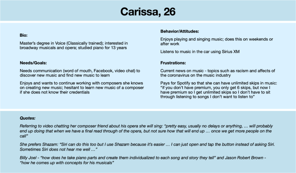 I created user personas based on my initial research results to help in focusing on the target audience for the Ask a Musician application. The intended user persona is shown below.