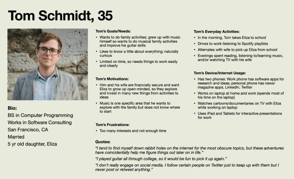Tom Schmidt would want to use the Ask a Musician Application for ideas to create more family time. The manner in which he would use the application is described: