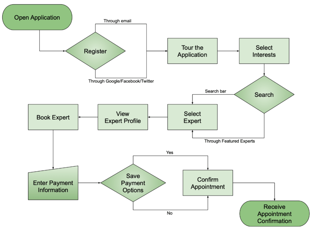 Based on Tom’s customer journey map, I created user flows on how he would use the application for his needs. The user flow below shows his process to complete booking an appointment with an expert musician.