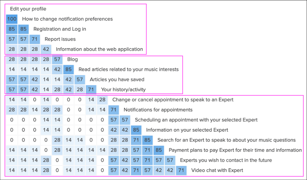 The next step was to begin structuring the information architecture of the application. I used OptimalSort to ask seven participants to open sort 17 cards with the important application features. The OptimalSort Similarity Matrix showed that there are roughly three main categories: Account information, Articles/Blog, and Experts. These are boxed and highlighted in the image below.