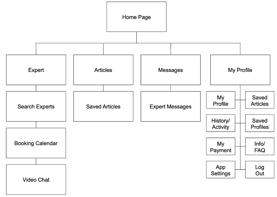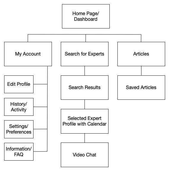 The navigation sitemap was upgraded after the low- and mid-wireframes. It became clear that an expert messaging section was needed for easier accessibility. Therefore, a user could quickly access the separate messaging if need be. In addition, the user account section was expanded to include a variety of options.
