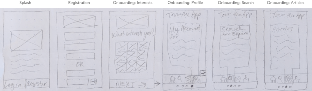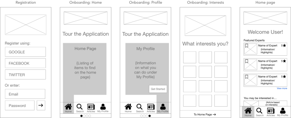 Once the navigation was completed, I moved onto rapid prototyping. While rapid prototyping is an iterative process, I wanted to briefly describe some of my progress. I started with pencil sketched low-fidelity wireframes, including different ideas to create different screens. Once I was done brainstorming, I selected the best low-fidelity wireframes to be digitalized and upgraded to mid-fidelity wireframes. With each upgrade, I added more details and features available on the screens.