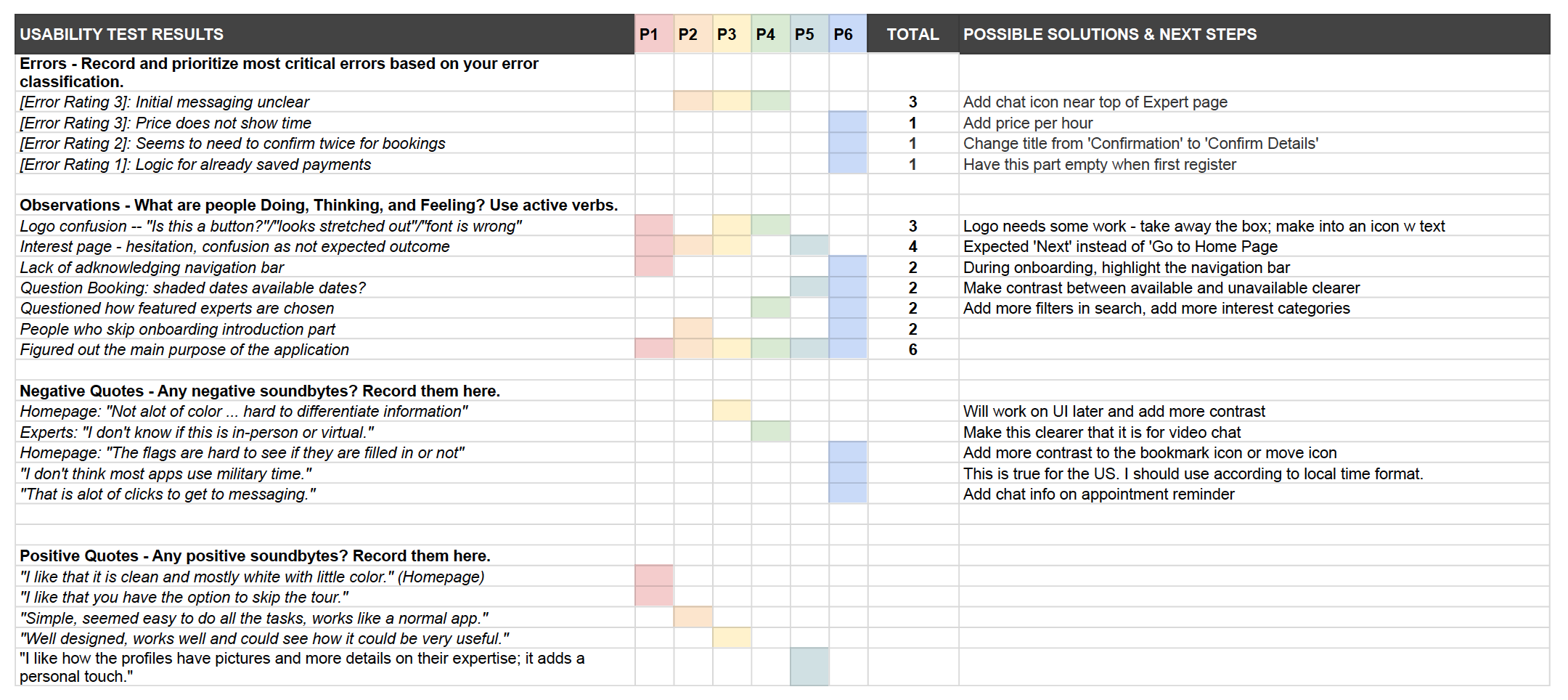 After affinity mapping the participant errors as well as the negative and positive quotes, the data was synthesized onto a rainbow spreadsheet. The Error rating scale was based off of Nielsen’s Error Severity Ratings, where an Error Rating of 4 was the maximum. The summary is shown below:
