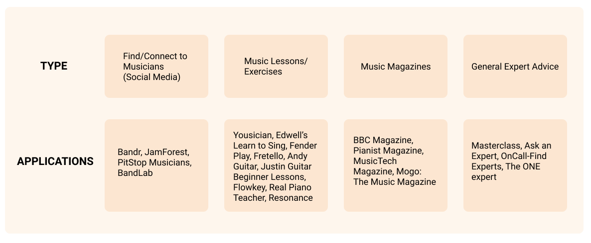 From the competitive analysis, I planned to encompass a larger range of musical topics/instruments and seek experts with standard professional experience for the application.