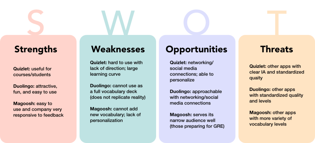 I conducted a competitive analysis of three different vocabulary mobile applications to better understand the current applications available and to strategize how my application would stand out among the existing applications. I investigated Quizlet, Tinycards by Duolingo, and GRE Vocabulary Flashcards by Magoosh.