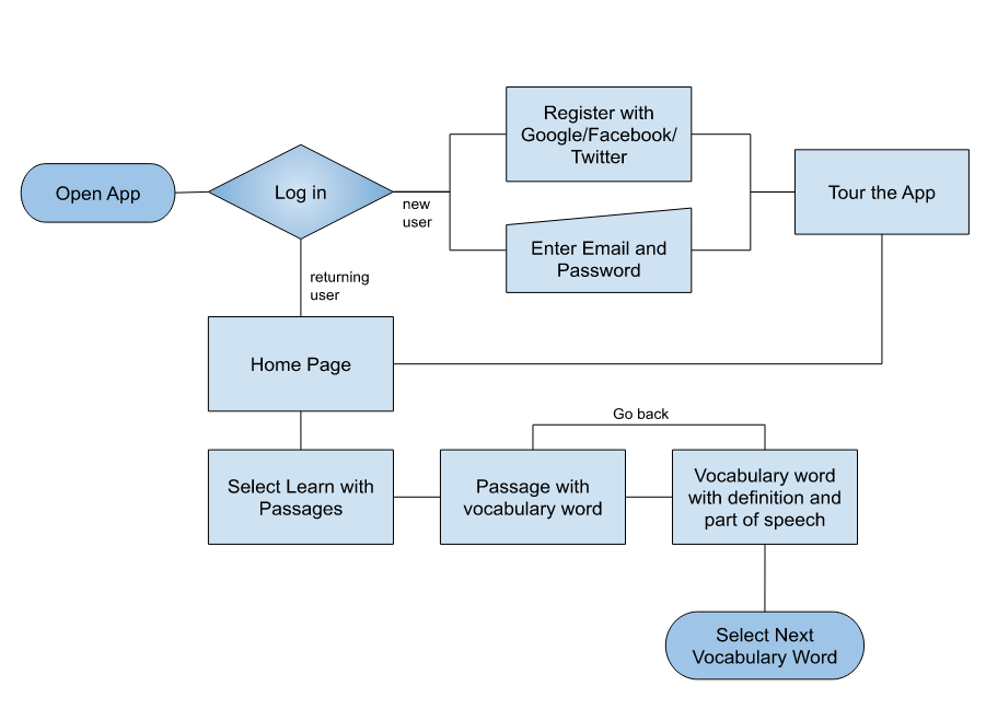 To begin planning the application, I created user flows to show how specific application features would be accessed. Shown below is a user flow of how a user would view one complete vocab flashcard.