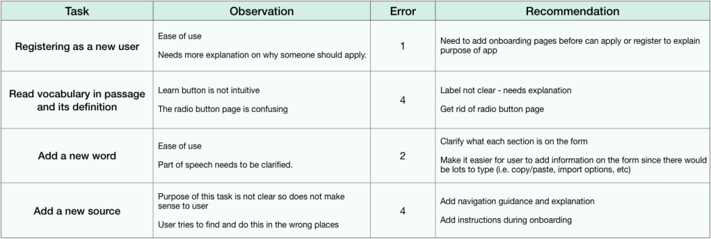 Nielsen’s Error Severity Rating Scale was used to analyze the usability testing results, whereas 4 indicated an extremely severe error that needed to be prioritized and fixed. The table below shows the tasks that users were asked to perform during the testing, the observations with Nielsen’s Error Severity Ratings, and the recommended methods to improve the application.