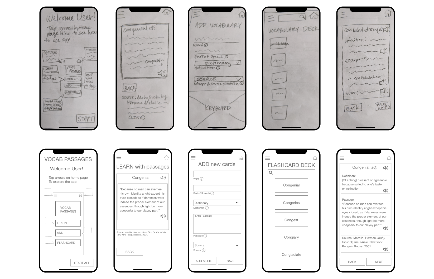I performed in-person and remote moderated usability testing with the low-fidelity prototype. The goal of the testing was to determine the learnability and the efficiency of the application’s main features such as onboarding, viewing a vocabulary word, adding a vocabulary word, and adding additional sources for excerpts.