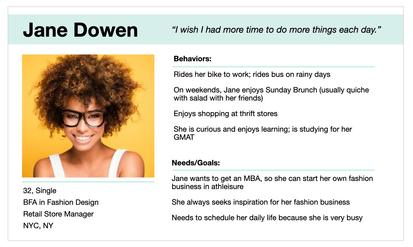 Jane needs a way to schedule in daily studying that can inspire so she can prepare for the GMAT while forming ideas for her athleisure business.