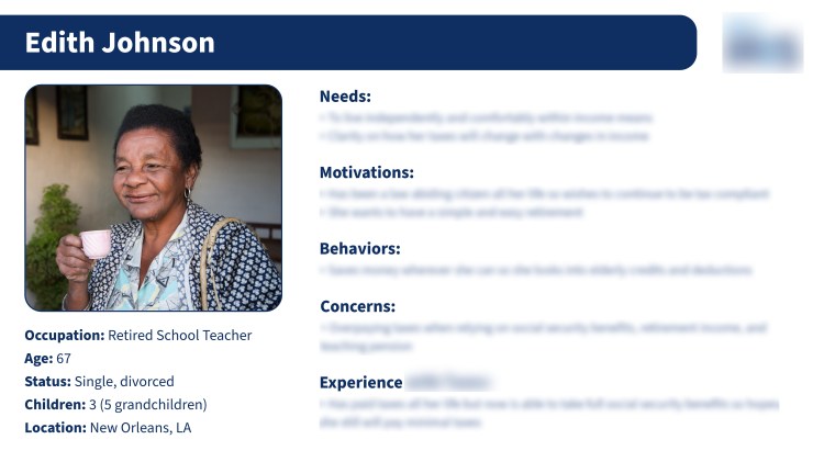 - Development of personas with journey maps (i.e. sample persona shown below)
