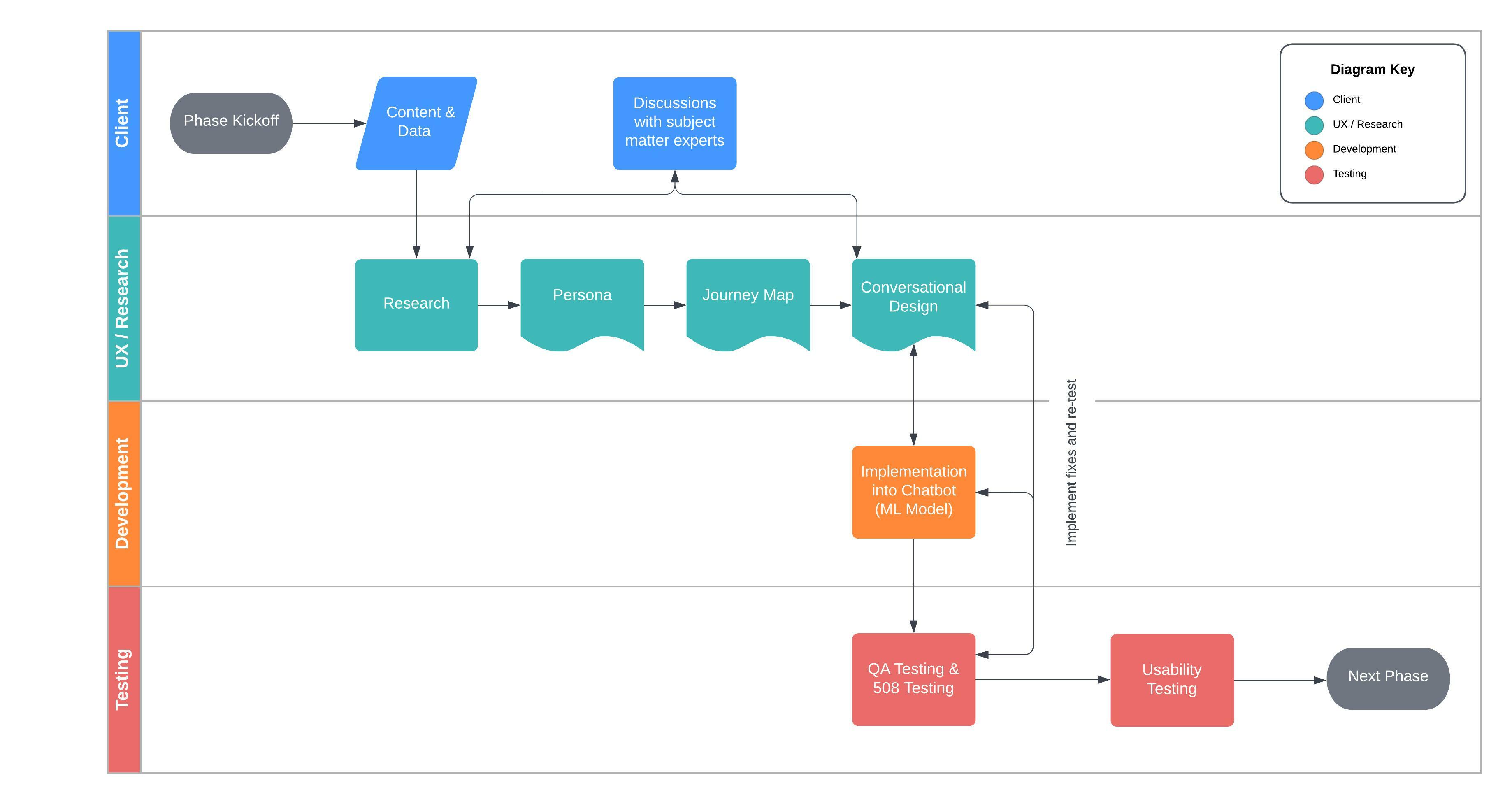 The following graph shows the general process created to meet the goals and objectives for this phase. Within two week sprints, we met with the client four times, performed and discussed researched content, created one persona with a journey map, and designed roughly four conversations for the chatbot based off of the researched content and persona. Once materials were implemented into the chatbot, iterative testing and updates were performed.