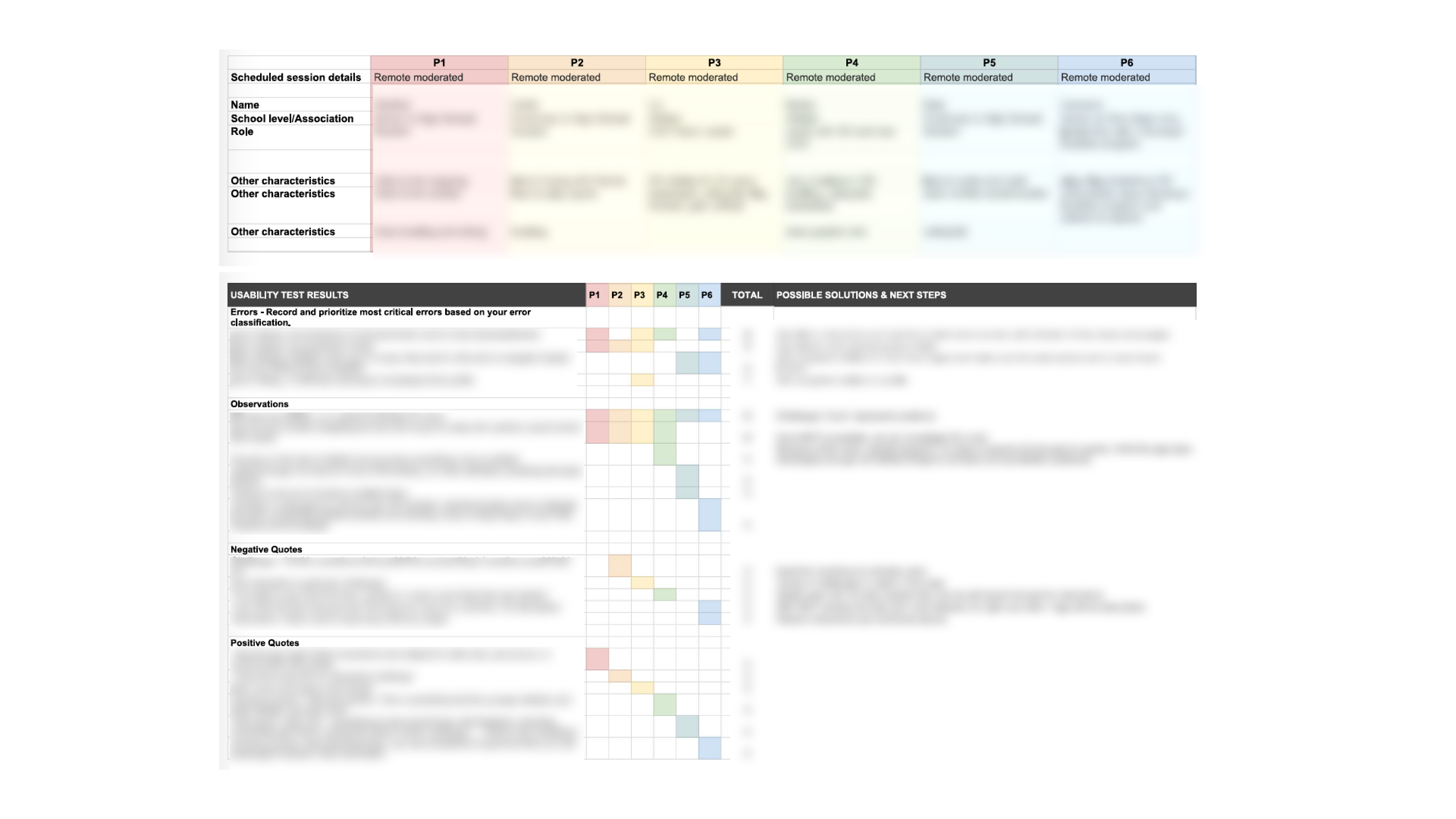 Along with qualitative observation of the sessions, quantitative metrics were gathered based on task completion, end of session survey responses, and Nielson’s Error Rating Scale. The data was synthesized using affinity diagramming and a rainbow spreadsheet.